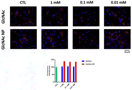 To verify whether GlcNAc and GlcNAc NP were able to stimulate collagen type II, cells were treated with both forms of GlcNAc, and then the collagen type II was evidenced by immunofluorescence and compared to the production in untreated cells. The findings showed that the GlcNAc was not able to increase collagen type II production, whereas, even if not to a statistically significant level, GlcNAc NP was able to stimulate collagen production (Figure 6).