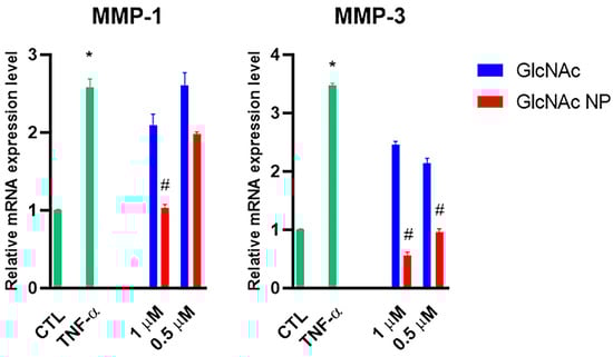 Effects of GlcNAc and GlcNAc NP on MMPs under TNF-α stimulus. Cells were left untreated (CTL), stimulated with 10 ng/mL TNF-α for 24 h, or stimulated with 10 ng/mL TNF-α and treated with 1 μM and 0.5 μM of GlcNAc and GlcNAc NP for 24 h. After 24 h treatments, mRNA was extracted and analysed by RT-PCR. MMP-1 and MMP-3 mRNA levels were reported as relative mRNA expression levels with respect to 18S mRNA (2−ΔΔCt method). Results are expressed as mean ± SD of data obtained by three independent experiments. * p < 0.05 vs. CTL; # p < 0.05 vs. TNF-α.