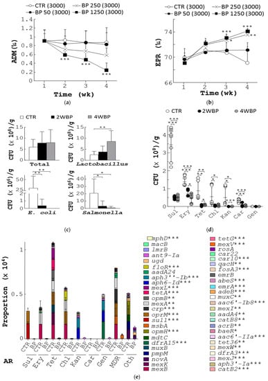 Next, we examined the effect of BP on composition and AR of fecal bacteria in laying hens aged 58 weeks. The total count of fecal bacteria seemed to increase over time (Total, Figure 1c). Moreover, BP significantly increased fecal Lactobacillus in chickens with 2-week and 4-week treatment (Lactobacillus, Figure 1c). Conversely, BP dramatically decreased fecal E. coli and Salmonella in chickens with 2-week and 4-week treatment (E. coli and Salmonella, Figure 1c). Of note, fecal bacteria from control birds showed extremely high AR to seven antibiotics, sulfonamide (Sul), tetracycline (Tet), chloramphenicol (Chl) and erythromycin (Ery), carbenicillin (Car), kanamycin (Kan), and gentamicin (Gen) (CTR, Figure 1d). In contrast, fecal bacteria from those fed with BP for 2 and 4 weeks showed a significant dose-dependent reduction in AR (2WBP and 4WBP, Figure 1d).