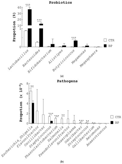 Next, we compared the composition of fecal bacteria in control and BP-fed birds (Figure 1) using 16S rDNA next generation sequencing (NGS) analysis. First, we analyzed the operational taxonomic units (OTUs). The number of sequences, OTUs, and diversity indices in the feces of both bird groups are summarized in Table S1. Rarefaction curves showed that the number of sequences from two bird groups were enough to uncover the major OTUs (Figure S1B). The fecal microbiota of control hens (CTR), aged 58 weeks, had higher diversity than BP-fed hens (BP) as evidenced by Shannon and Chao1 diversity indices (Table S1). Detailed changes at the order, family, and genus levels under BP treatment are shown in Table S1 and Figure S1C. Seven beneficial bacterial genera, Lactobacillus (75.1%), Bacteroides (20.9%), Bifidobacterium (1.7%), Alistipes (1.6%), Butyricicoccus (0.4%), Megamonas (0.3%), and Megasphaera (0.1%), were most abundant in the control stools (CTR, Figure 2a). BP increased the above seven genera though only Lactobacillus, Bacteroides, and Butyricicoccus were statistically significant (BP, Figure 2a). In contrast, 13 harmful bacterial genera, Escherichia/Shigella (40.5%), Flavonifractor (15.6%), Oscillibacter (11%), Staphylococcus (8.5%), Phascolarctobacterium (6.5%), Salmonella (5.9%), Pseudoflavonifractor (5.9%), Anaeroplasma (3.7%), Odoribacter (0.9%), Streptococcus (0.7%), Gallibacterium (0.5%), Aeromonas (0.2%), and Anaerotruncus (0.1%) were most abundant in the control stools (CTR, Figure 2b). Notably, BP reduced the above 13 genera though only Escherichia/Shigella, Staphylococcus, Phascolarctobacterium, Salmonella, Odoribacter, and Streptococcus were statistically significant (BP, Figure 2b).