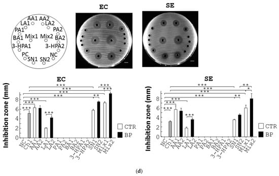 The MAC and MIC of BP for bacteria were measured in six replicates as published []. For MAC tests, L. reuteri (5 × 105 CFU/mL) was incubated with BP (2 to 128 µg/mL), Amp (10 µg/mL), and 0.1% methanol (NC) at 37 °C for 10 h. For MIC tests, E. coli and S. enterica at 5 × 104 CFU/mL were incubated with BP (100 to 6400 µg/mL), Amp (10 µg/mL), and 0.1% methanol at 37 °C for 18 h. Bacterial growth (%) was calculated as ratio of optical density at 600 nm (OD600) of the treatment group to that of the NC group multiplied by 100. For disc diffusion assays, E. coli and S. enterica grown on LB plates were incubated for 14 and 12 h, respectively, with MRS medium (150 µL), LB agar disc, water (5 µL), a paper disc soaked with Chl (1 µg), and supernatant (150 µL) and agar discs of L. reuteri grown for 16 h. Alternatively, the same disc diffusion assays were performed for both pathogens, except that each had a mixture of 5 SCFAs, which had the same dosages as those in L. reuteri supernatant in MRS broth with or without BP. Likewise, L. reuteri grown on MRS plates were incubated with LB medium (150 µL), MRS agar disc, water (5 µL), a paper disc soaked with Chl (1 µg), and agar discs of E. coli or S. enterica grown for 16 h. The diameter of the inhibition zone was photographed and measured using ImageJ software. The IC50 value of each SCFA against both pathogens was determined using OD600.