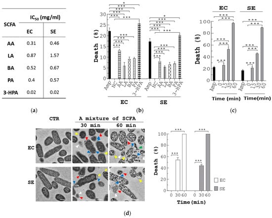 Anti-pathogenic mechanism of SCFA produced from L. reuteri. (a) The IC50 of each SCFA for E. coli (EC) and S. enterica (SE) was determined. (b) Each of the pathogens (5 × 107 CFU/mL) were grown in LB broth containing vehicle (NC), Amp (30 µg/mL), and each SCFA at its IC50 dose for 30 min, followed by PI staining. The bacteria were analyzed with flow cytometry to determine the percentage (%) of dead cells. (c,d) E. coli (EC) and S. enterica (SE) were treated with Amp and a mixture of the 5 SCFAs at the same doses as those in the feces of BP-fed chickens, for the indicated times. One aliquot of the bacteria was stained with PI and analyzed with flow cytometry to determine the percentage (%) of dead cells (c). The other aliquot of E. coli (EC) and S. enterica (SE) was analyzed using TEM. Their representative images are shown (left, d). Arrowheads in yellow, red, white, and blue indicate separation of the cytoplasmic and outer membranes, distorted outer membrane, empty cells, and membrane discontinuity, respectively. Their death (%) was quantified and replotted into histograms (right, d). Scale bar = 0.5 µm. (e) Three-week-old chickens (n = 3) were fed with standard diet (CTR) and the diet containing 250 ppm BP for 4 weeks. Fecal extracts were subjected to LC-MS/MS analysis, followed by quantification of 5 SCFAs (µg/g of feces). Data from 3 repeats are presented as the mean ± SD. One-way ANOVA tests were used for statistical analysis of differences between groups and p (*) < 0.05 and p (***) < 0.001 are considered statistically significant.