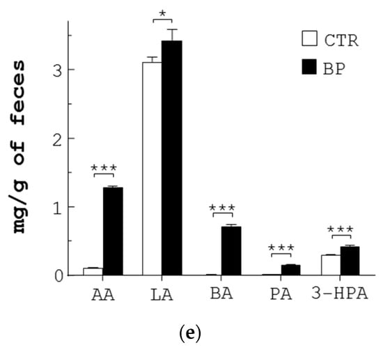 We also confirmed the presence of the 5 SCFAs in stools of control and BP-fed chickens. The UPLC/MS data showed that the amount of 5 SCFAs per gram of control chicken stools in descending order was: LA (3.11 mg) > 3-HPA (0.3 mg) > AA (0.11 mg) > BA ≈ PA (0.01 mg) (CTR, Figure 4e). In contrast, the amount of 5 SCFAs per gram of BP-fed chicken stools in descending order was: LA (3.43 mg) > AA (1.29 mg) > BA (0.72 mg) > 3-HPA (0.43 mg) > PA (0.16 mg) (BP, Figure 4e). Over 4 weeks, BP upregulated the level of AA, PA, and BA to a greater extent than LA and 3-HPA in chicken guts. Overall, BP significantly escalated the level of fecal SCFA in chickens.