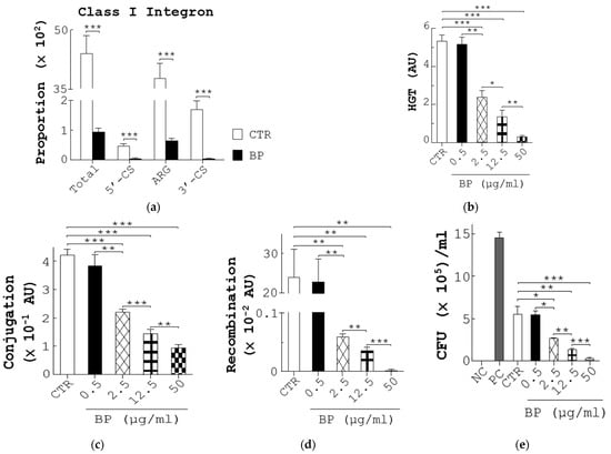 To explore the mechanism by which BP decreased AR in fecal bacteria, we first analyzed the composition of genes corresponding to class 1 integrons, implicated in ARG transfer in bacteria, in the fecal microbiome of chickens (Figure S5A). Unexpectedly, a high proportion of the total sequencing reads corresponding to the class 1 integrons, composed of 5′-conserved segment (5′-CS), ARG, and 3′-conserved segment (3′-CS), were found in the control fecal microbiome (Total, 5′-CS, ARG, and 3′-CS, CTR, Figure 5a). Conversely, BP profoundly reduced the proportion of total reads and the elements of the class 1 integrons, suggesting a reduction of ARG by BP (BP, Figure 5a). Next, to study the action of BP on HGT of ARG, we first adopted an interbacterial conjugation and recombination system composed of a donor E. coli strain (β2163), harboring pD042 plasmid, and a recipient E. coli strain (UB5201), harboring p3938 and p929 plasmids, as published []. A co-incubation of donors and recipients in this system generated an HGT frequency of 5.4 arbitrary units (AU) (CTR, Figure 5b). In contrast, BP dose-dependently reduced this frequency (BP, Figure 5b). To further pinpoint the action of BP on conjugation and recombination steps, three assay platforms were applied. The first was a conjugation platform composed of a donor E. coli strain (BM21), harboring RP4 plasmid, and a plasmid-free recipient E. coli strain (MG1656 (ΔdapA(::frt) recA−(Tn10))) as published []. A co-incubation of donors and recipients in the assays generated a conjugation frequency of 4.2 × 10−1 AU (CTR, Figure 5c). In contrast, BP dose-dependently reduced this frequency (BP, Figure 5c). The second platform was a recombination platform composed of a donor plasmid, pD042, and a recipient E. coli strain (UB5201), harboring p3938 and p929 plasmids, as published []. After pD042 was transformed into recipients, the recombination frequency of the recipients in vehicle groups was 23.9 × 10−2 AU (CTR, Figure 5d). In contrast, BP dose-dependently reduced this frequency (BP, Figure 5d). The third platform was to use the Gateway recombination system to assess the action of BP on integrase activity. As expected, no recombination was observed in the mixture of pEXP7-Tet and pDONR221 in the absence of integrase (NC, Figure 5e). However, there was a recombination frequency of 14.6 × 105 CFU/mL in the mixture of pEXP7-Tet, a positive control, pDONR221, and integrase (PC, Figure 5e). Similarly, there was a recombination frequency of 5.6 × 105 CFU/mL in the mixture of the DNA comprising attB and ampR (CTR), pDONR221, and integrase (CTR, Figure 5e). In contrast, BP dose-dependently reduced this recombination frequency (BP, Figure 5e), suggesting the inhibition of integrase activity by BP. Taken together, BP reduced ARG in bacteria via downregulation of HGT involving inhibition of conjugation, recombination, and integrase.