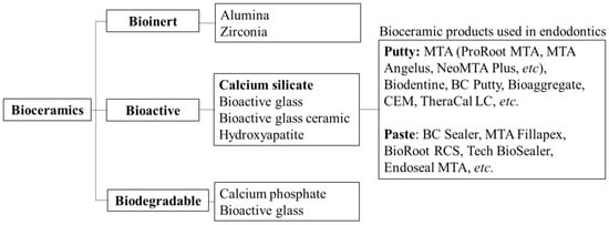 In the early 1990s, bioceramics were introduced in the field of endodontics as a new group of dental materials. A mapping review of dental biomaterials found that bioceramics were a research focus between 2007 and 2019 [1]. Bioceramics are biocompatible ceramic materials or metal oxides including alumina, zirconia, bioactive glass, glass ceramics, hydroxyapatite, calcium silicate, and resorbable calcium phosphate. Bioceramics can be classified as bioinert, bioactive, and biodegradable materials based on their reactivity with surrounding tissues [2,3] (Figure 1). Bioceramics used in endodontics are generally bioactive, among which calcium silicate-based cements (CSCs) are the most common [4]. In addition to having excellent physical and chemical properties, CSCs play an important role in endodontic therapy due to their biocompatibility and bioactivity [5,6].