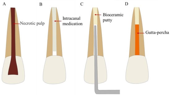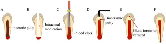 Regenerative endodontic treatment (RET) is an alternative to apexification in suitably selected cases and shows better results than apexification in increasing root thickness and length [199,221]. Blood clot induction, also known as revascularization, is a commonly used RET technique. Revascularization stimulates blood clots in the periapical tissues of teeth after removing the infection in the root canal by disinfection, which recruits stem cells around the root to proliferate, differentiate, and promote the formation of “new pulp tissues” in the root canal [222,223] (Figure 10). MTA is the most widely applied sealing material in RET and has an excellent overall survival rate [224,225].