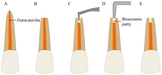 Orthograde filling generally refers to the apical barrier technique, which transports MTA or other materials from the coronal side of the root canal to the apical position to seal the apex of the tooth and provide conditions for the rigorous root canal filling [71] (Figure 3). MTA has been widely used in the apical barrier technique and has achieved long-term clinical and radiographic success [72,73,74,75,76]. In a case series of 5–15 years, MTA as an apical barrier for the treatment of nonvital immature teeth achieved a healing rate of 96% [77].