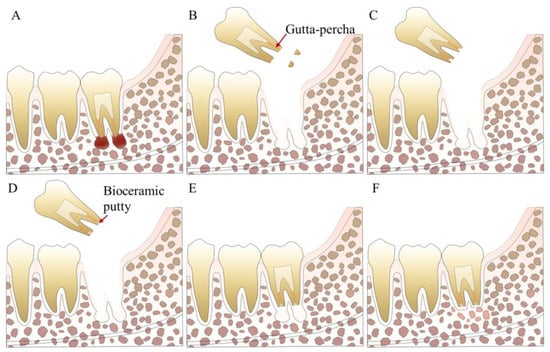 Treatment procedures for IR. (A) A tooth with refractory periapical disease. (B) Tooth extraction and root-end resection. (C) Root-end preparation. (D) Root-end filling with bioceramic putty. (E) Tooth replantation. (F) Apical inflammation disappears.