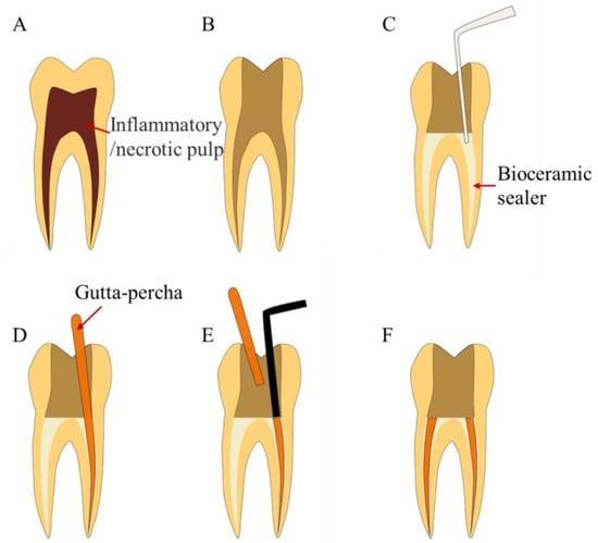 Root canal therapy is the most effective and most common method for treating pulpal and periapical diseases [124]. The single-cone technique is an easy-to-operate and time-saving method of root canal therapy, with sealer as the main material and gutta-percha as an auxiliary [125] (Figure 6). In addition, the GentleWave system utilizes advanced fluid dynamics to clean root canals, minimizing excessive cutting caused by mechanical preparation and reducing the risk of intracanal separation of Ni–Ti rotary instruments [126,127,128]. After root canal cleaning, hydraulic condensation with bioceramic sealer is used for root canal obturation, especially for irregular root canals. These techniques are increasingly dependent on the root canal sealer, so the fluidity and other physicochemical properties of the sealer play a crucial role in the success of treatment [129]. Bioceramic sealers, such as BC Sealer, possess good biocompatibility, superior fluidity, and chemical stability. When applied to the single-cone technique, bioceramic sealers have achieved satisfactory short-term clinical results [130,131].