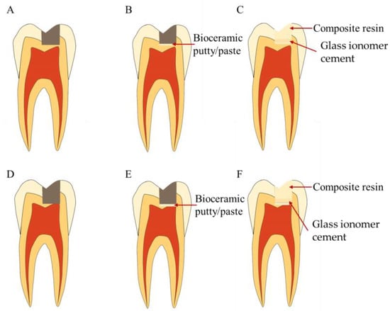 Treatment procedures for pulp capping. (A–C) Treatment procedures for indirect pulp capping. (A) Caries or defect close to the pulp. (B) Indirect pulp capping with bioceramic putty or paste. (C) Coronal filling. (D–F) Treatment procedures for direct pulp capping. (D) Caries or defect in contact with the pulp. (E) Direct pulp capping with bioceramic putty or paste. (F) Coronal filling.