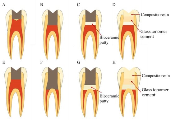 Pulpotomy is a method to remove inflamed pulp tissue and cover the pulp section with a pulp-capping agent to retain healthy pulp tissue [164]. Pulpotomy can be divided into partial and complete pulpotomy according to the depth of pulp resection [165] (Figure 8). The application of MTA in pulpotomy can achieve outstanding results, which is supported by high-quality evidence [166,167,168,169,170,171]. Studies have shown that MTA has a better success rate than calcium hydroxide in mature permanent teeth undergoing partial pulpotomy [172,173,174].