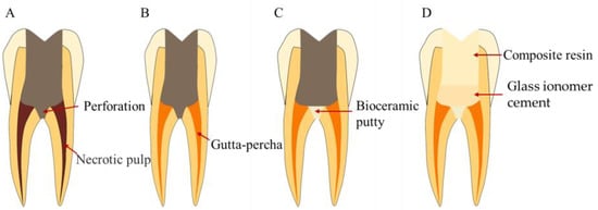 Treatment procedures for perforation repair. (A) Perforation in the floor of the pulp chamber. (B) Root canal therapy. (C) Perforation repair with bioceramics. (D) Coronal filling.