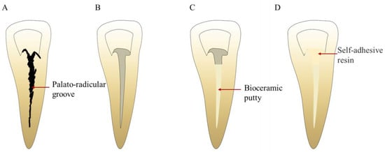 The palatal-radicular groove (PRG) is defined as a developed groove in the root, usually located on the palatal side of the maxillary incisors [258] (Figure 12). PRG is a developmental abnormality, most likely due to genetic factors [259]. PRG must be filled to block the infection pathway after cleaning and preparation, and the filling materials include glass ionomer cement (GIC), composite resin, and CSCs [260].