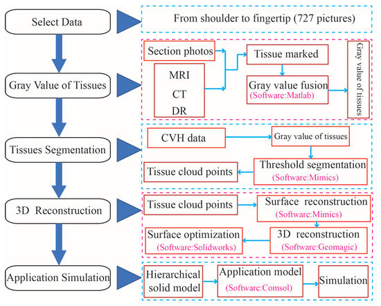 A high-precision digital arm model was constructed based on the CVH image dataset developed by the Army Medical University [37,40,41]. A total of 2518 cross sectional images (slice thickness: 0.10 mm and 0.20 mm for the head, 0.50 mm for the knee joint, and 1.0 mm for other parts) were obtained from a male cadaver with a body length of 172 cm (the maximum extension from head to toe). The slice resolution was 6,291,456 (30,722,048) pixels. The images (n = 1756) were extracted as the whole-body data of the digital human, with a sampling interval of mm. To build a complete and high-precision arm model, 727 images starting from the shoulder (the first image) were extracted and ending at the finger (the last image) as the fundamental data for CDA 3D reconstruction.