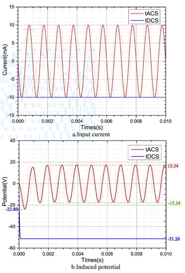 According to the DC and AC electrical stimulation characteristics, and considering human safety, a 10 mA DC electrical signal and an AC electrical signal with an amplitude of 10 mA and a signal frequency of 1 kHz were injected into the model (see Figure 2). To analyze the electrical signal changes in the body under the two modes, in terms of tissue electrical characteristics, the carrier frequency of the DC electrical signal was 0, which complicates the model calculation and comparison. Therefore, in model calculation, 1 kHz was used for both DC and AC signal stimulation.