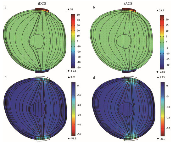 Potential distribution diagram on the cross section. (a,b) Coupling potential distribution of DC and AC stimulation on the cross section, respectively. (c,d) Current density distribution of DC and AC stimulation on the cross section, respectively.