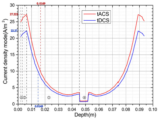 The current density along the geometric center line of the two electrodes was extracted for analysis to intuitively analyze the distribution of signal current density on the section (Figure 5).The red line is the distribution of the tACS current density, and the blue line is the distribution of the tDCS current density. At the contact between the electrode and the skin, the coupling current density generated by tACS is 24.96 A/m, while the coupling current density generated by tDCS is 20.51 A/m, and the coupling current density of tACS is 21.7% higher than that of tDCS. At the contact of the skin layer ① and the fat layer ②, the coupling current density generated by tACS is 25.72 A/m, while the coupling current density generated by tDCS is 21.12 A/m, and the coupling current density of tACS is 21.8% higher than that of tDCS. At the contact of the fat layer ② and the muscle layer ③, the coupling current density generated by tACS is 27.223 A/m, while the coupling current density generated by tDCS is 22.27 A/m, and the coupling current density of tACS is 22.2% higher than that of tDCS. In cortical stimulation, the effect of tACS is significantly better than that of tDCS. At the same time, due to the good diffusivity of the muscle layer, the current signal diffuses rapidly in the muscle layer, and the current density is attenuated rapidly. At the muscle and the bone, the coupling current density of tACS is attenuated to 0.96 A/m, while the coupling current density of tDCS is attenuated to 0.76 A/m, both of which are attenuated nearly 30 times. In the process of electrical stimulation, assuming that the effective current density of the targeting is greater than or equal to 10 A/m, the maximum depth that tDCS can reach is 14.9 mm, while tACS can reach 16.9 mm, and the 2 mm difference in effective depth can determine whether it acts on the neural targeting. In the body, the induced current intensity of AC stimulation is higher than that of DC stimulation. Simultaneously, under the equivalent intensity, the depth of AC stimulation is also better than that of DC stimulation. Therefore, when deep electrical stimulation is applied to the body, the system with the AC stimulation signal is better than the system with DC stimulation signal.