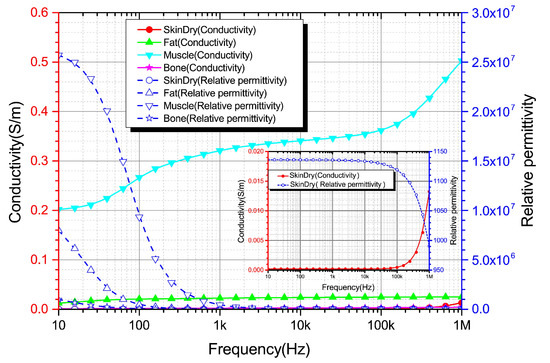 After completing the model geometry configuration, the carriers of 1 kHz to 1 MHz are loaded into the model to accurately manifest the electrophysiological characteristics of the human tissues. In combination with the volume conductor theory, the conductivity, and the dielectric constant [50,51] of the tissues are shown in Table 1.