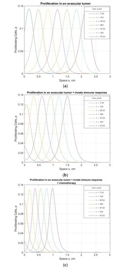 Numerical solutions for the proliferating cell density of an avascular tumor (a) without extratumoral interactions, (b) with the response of the innate immune system, (c) with the response of the innate immune system under the effect of chemotherapy, as functions of space x at times t = 0…52.5 days.