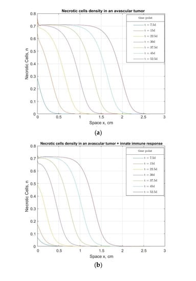 In Figure 2, the necrotic cell density N is presented for all three considered steps of the model. Figure 2a shows the density of a simple avascular formation without any side effects, yielding approximately 0.7 × 109 cells/cm3 (after 30 days). With the addition of the immune system cells’ effects in Figure 2b, the number of necrotic cells stops growing, meaning that the number of quiescent turning necrotic and, therefore, the number of proliferating cells turning quiescent, has declined as well, to 0.69 × 109 cells/cm3. After the introduction of a chemotherapeutic drug in Figure 2c, the necrotic cell density slightly decreases, which supports the earlier finding in Figure 1c, regarding the decrease in proliferation.