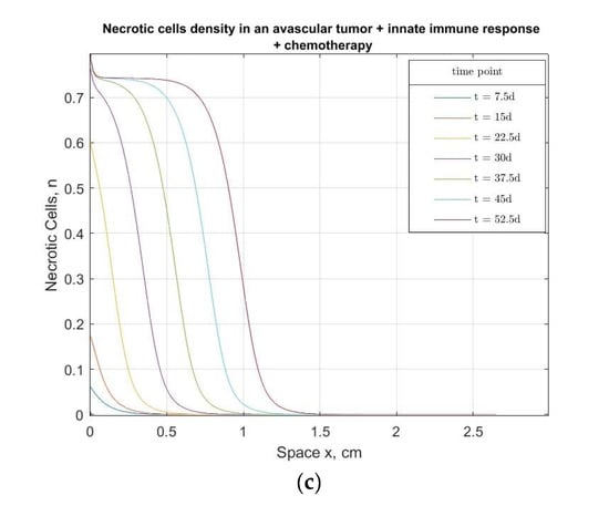 Numerical solutions for the necrotic cell density of an avascular tumor (a) without extratumoral interactions, (b) with the response of the innate immune system, (c) with the response of the innate immune system under the effect of chemotherapy, as functions of space x at times t = 0…52.5 days.