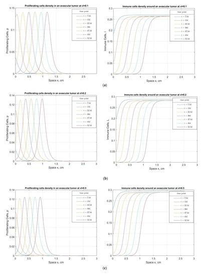 Numerical solutions of proliferating and immune cell densities, for three different levels of immune responses at (a) = 0.1, (b) = 0.2, (c) = 0.5 under the effect of chemotherapy, as functions of space x at times t = 0…52.5 days.