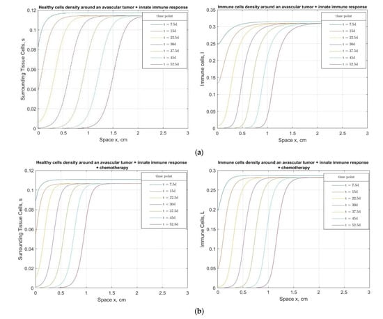 Numerical solutions of surrounding healthy and immune cell densities (a) before the drug intake, (b) under the effect of chemotherapy, as functions of space x at times t = 0…52.5 days.