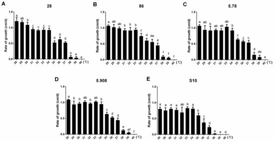 The growth rate of strains under different temperature treatments. (A–E) indicates the growth rate of different strains ‘28’, ‘86’, ‘5.78’, ‘5.908’, and ‘S10’ of W. cocos under temperature treatment. All data are means ± SD of at least three technical replicates, and use the method of multiple comparison of LSD to analysis the differences, significant difference is represented by different letters a–f, ‘cm/d’ means centimeter per day.