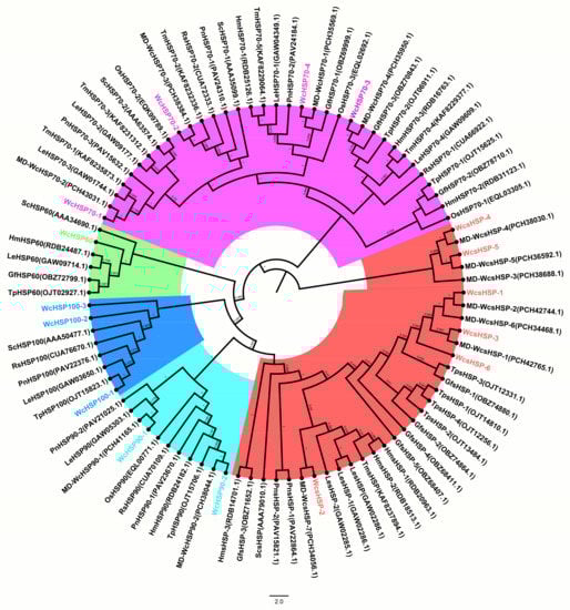 Phylogenetic analysis of heat shock proteins from different species. Different colors represent different subfamilies; red color denotes WcsHSP subgroup; green color denotes WcHSP60 subgroup; purple color denotes WcHSP70 subgroup; turquoise color denotes WcHSP90 subgroup and blue color denotes WcHSP100 subgroup. The numbers near the branches denote bootstrap values.