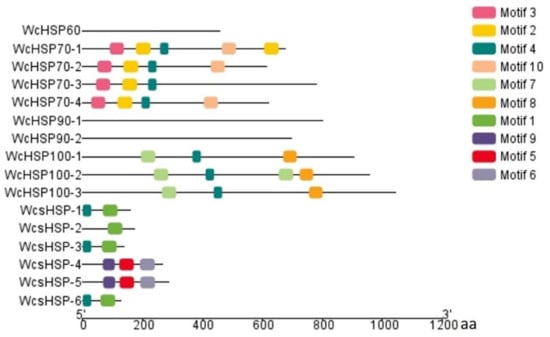In addition, we determined that most of the genes showed similar motif patterns within the same subgroup but different among the families (Figure 3). For example, no conserved motif was identified in WcHSP90 and WcHSP60 family genes (Figure 3), hence the functional of these family genes are quite different from the other subgroups. All members of WcHSP70 have almost similar motif patterns with few exceptions, and three motifs (Motif 2, 3, and 4) were present in all four members. However, Motif 10 was present in all members except WcsHSP-3. In addition, three motifs (Motif 4, 7, and 8) were detected in all members of WcHSP100, while WcHSP100-2 contained one extra Motif 7. Moreover, WcsHSP-1, WcsHSP-2, WcsHSP-3, and WcsHSP-6 showed more similarity with each other compared to other members of WcsHSP subfamily. However, WcsHSP-4 and WcsHSP-5 were also very similar to each other. These conserved motifs may hold the key to understanding the way different heat shock proteins contribute to different biological functions.
