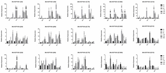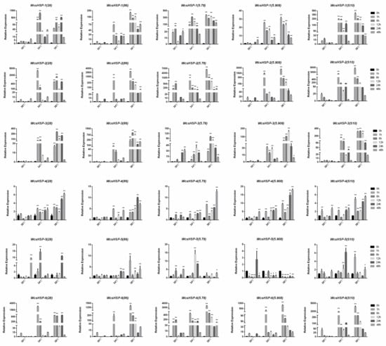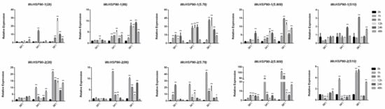 As shown in Figure 5, the expression profiles of the most WcHSP90s could be induced by the high temperature. Among them, the expression of WcHSP90-1 was increased in different cultivars, then decreased with the increase in temperature and time, but not significantly. The highest and the lowest expressions were noticed in ‘5.78’ and ‘S10’ strains, respectively. Following 6 h of treatment at 38 °C, the highest expression level was observed, indicating that high temperature induces WcHSP90-1 gene expression. Moreover, high temperature has a more significant effect on WcHSP90-2, which peaked at 1 h after 38 °C treatment, especially in the strain ‘5.908’ (Figure 5). In short, WcHSP90-1 and WcHSP90-2 showed similar expression patterns and displayed an increase in expression with increase in temperature.