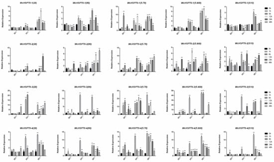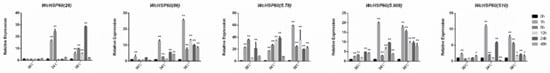 Analysis of expression patterns of WcHSP-70 gene under different temperature treatments. The different strains ‘28’, ‘86’, ‘5.78’, ‘5.908’, and ‘S10’ of W. cocos are shown. All data are means ± SD of three technical replicates; the 0 h sample is taken as control, two-way ANOVA was employed to analyze the data, and significant differences are represented by asterisks: * p < 0.05; ** p < 0.01.
