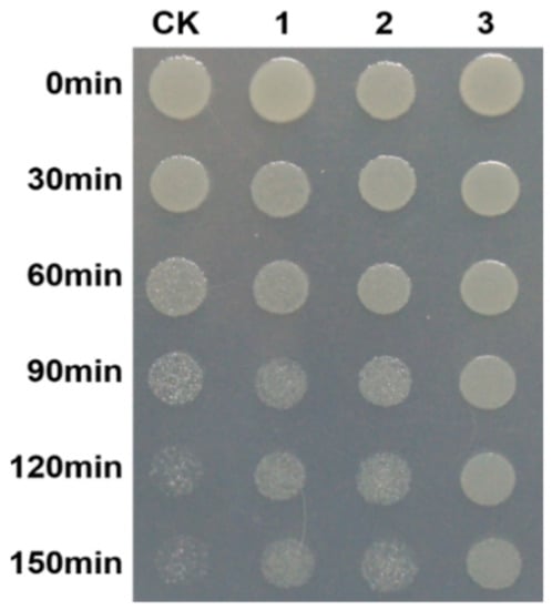 E. coli BL21 containing pET-32a (+) expression vector was inoculated in Luria–Bertani (LB) medium containing ampicillin (Amp) resistance at 1% volume fraction, expanded to optical density 600 (OD600), 0.6–0.8 at 37 °C, induced by 1 mM Isopropyl-beta-D-thiogalactopyranoside (IPTG) for 3.5 h, and then adjusted to OD600, 0.6–0.8 again. The difference of each OD600 was kept within 0.002. After induced expression, 200 μL of the bacterial solution was transferred to a centrifuge tube and was heated in a water bath at 50 °C for 0 min, 30 min, 60 min, 90 min, 120 min, and 150 min, respectively. A total of 2 μL of samples was extracted into LB medium plate and was cultured at 37 °C for 12–16 h, with 3 replicates per gradient.