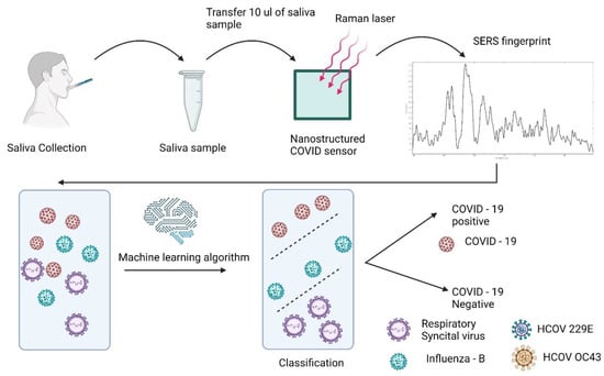 - Carlomagno, C.; Bertazioli, D.; Gualerzi, A.; Picciolini, S.; Banfi, P.I.; Lax, A.; Messina, E.; Navarro, J.; Bianchi, L.; Caronni, A.; et al. COVID-19 salivary Raman fingerprint: Innovative approach for the detection of current and past SARS-CoV-2 infections. Sci. Rep. 2021, 11, 4943. [Google Scholar] [CrossRef] [PubMed]