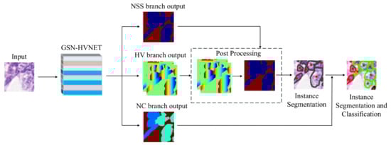 Figure 1 shows an overview of the GSN-HVNET for simultaneous nuclei instance segmentation and classification. The network input starts with images, which are center patches cropped out from the sample images of size . The model can simultaneously segment the nuclei and predict nuclei types and HV-Maps (horizontal and vertical maps). After a post-processing procedure, the nuclei instance can be obtained using HV-Map and nuclei pixel predictions. The final output results can be obtained by combining the segmentation results with the nuclei-type predictions. In other words, the network can complete the segmentation and classification of nuclei instances at the last step.