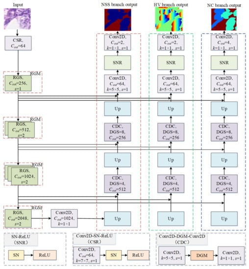 The structure of GSN-HVNET. Our proposed network contains an encoder and a decoder. The encoder, which extracts an effective set of features, is composed of a CSR block, four RGMs, and a Conv2D. The decoder is composed of three branches to achieve accurate nuclei instance segmentation and classification simultaneously.