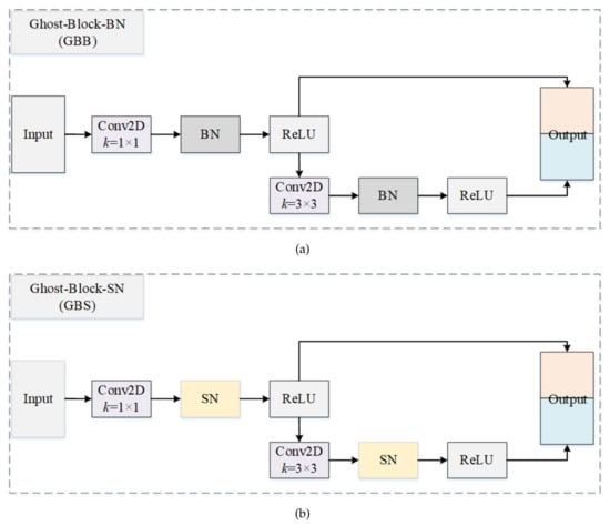 Figure 3 compares the structure of Ghost-Block-BN (GBB) [] and our suggested Ghost-Block-SN (GBS). As is known, Ghost-Block can help a convolutional neural network to generate more features at a much lower cost. To do that, a Ghost-Block first generates several intrinsic feature maps using ordinary convolution operation and then uses cheap linear operations to expand the features and increase the channels. The computational cost of the linear operations on feature maps is much lower than traditional convolution and transcends other existing efficient works. We can customize the kernel size of the primary convolution in a Ghost-Block, and point-wise convolution is employed in this paper. In the Residual-Ghost-Block (RGB), each Ghost-Block is followed by a BN layer, which offers several advantages, including stabilizing and speeding up the training procedure. However, the performance of GBB is severely restricted by the batch size. This is because BN only utilizes a single normalizer in the entire network, which can be unstable and hurt the accuracy in the case of a small batch size.