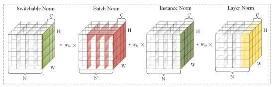 To solve the above problem, we apply switchable normalization (SN), which is robust to a wide range of batch sizes, whether a small batch size or not. As shown in Figure 4, SN measures channel-wise, layer-wise, and minibatch-wise statistics by using instance normalization (IN) [], layer normalization (LN) [], and batch normalization (BN) [], respectively, and tries to find an optimal combination by learning their important weights, ensuring the stability and accuracy of the network in the case of small batch size.