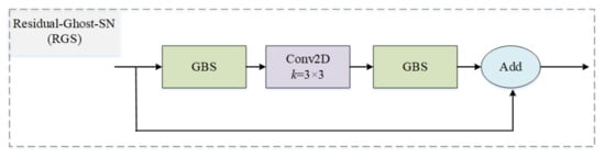 Our RGS adopts the structure of residual block—the essential building unit of residual neural network (ResNet) []—owing to its outstanding performance. The key idea behind residual block is to reformulate the layers as learning residual functions with reference to the layer inputs, instead of learning unreferenced functions. As shown in Figure 5, we embed the proposed GBS in a residual block as RGS. Later, several RGSs are stacked to form the RGM. Our network contains of four stacked RGMs with 1, 2, 3, and 1 RGS, respectively. Compared with original ResNet-50, our network employs fewer building units to extract feature maps and reduce redundant features, leading to a reduction in model size. In addition, our proposed RGS is generic and can be used in the construction of other lightweight deep learning architectures.