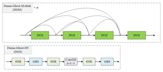 In this part, we propose a novel module applied to the decoder of GSN-HVNET. An example of the proposed module is shown in Figure 6, in which . Each DGS connects to other DGSs with forwarding feedback and employs GBS to extract feature maps. The feature maps from all preceding layers are utilized as current inputs, and the feature maps output by a DGS are used as inputs for all subsequent layers.
