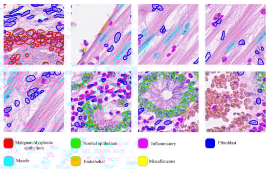 Extracting each nucleus and distinguishing its type can promote the diagnostic potential in present-day digital pathology pipelines. For instance, precisely distinguishing each nucleus from tumors or lymphocytes can significantly facilitate downstream analysis of tumor-infiltrating lymphocytes (TIL), which has been proven effective in predicting cancer recurrence []. The nucleus-by-nucleus classification has become another problem researchers have been interested in recently due to the high variability and diversity of nuclei appearance in a whole slide image.