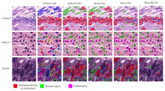 As aforementioned, the 4-class nuclei classification carried out in HoVer-Net is impractical for use in practical pathological diagnosis. Accordingly, we have reclassified the data. Table 6 lists the comparative results for 3-class nuclei classification on the CoNSeP dataset. Here, denotes the score for nuclei detection. , , and denote the classification score for healthy, inflammatory, and malignant/dysplastic epithelium classes, respectively. The results show that the proposed network outperforms all the others in terms of , , and scores. In Figure 8, we illustrate the results of nuclei segmentation and classification on the sample images and compare them with those of [,,,].