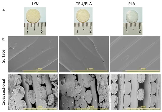 (a) Photographic images of the constructed disc-shaped scaffold. Images of TPU, TPU/PLA, and PLA scaffolds from the top view. Scale bar: 1 cm. (b) SEM images of the disc-shaped scaffolds from the surface and cross-sectional views of all scaffolds. Scale bar: 1 mm.