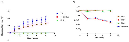 (a) The degradation rate of porous 3D-printed scaffolds. The TPU scaffold showed the highest degradation rate compared to other scaffolds. Moreover, the longer the time period, the higher the degradation rate. (b) pH analysis of the 3D printed scaffold extracts. The PLA extract showed no significant difference compared to PBS. However, in the first two weeks, a significant decrease in pH was observed in both the TPU and TPU/PLA extracts, which gradually reduced to below pH 7 after eight weeks.