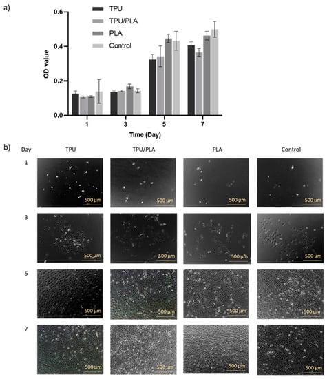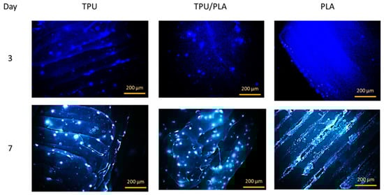 The attachment or adhesion of cells on the material is the basis for subsequent cell development and differentiation and an important indicator of the biocompatibility of the material. When cells are incubated with toxic biological materials, changes in morphology, proliferation, and adhesion provide valid data for assessing biocompatibility. Cell adhesion to our 3D-printed scaffolds was evaluated using an attachment assay in which cells were seeded directly onto the 3D-printed scaffolds. Within seven days, the cells not only adhered to and dispersed on the solid surfaces of the porous scaffold, but also migrated into the interior of the porous scaffolds, as seen in the fluorescence images in Figure 5. The epithelial cells were scattered on the TPU scaffold and its composite, while they were present in denser populations in the porous region of the PLA scaffold. This result is consistent with a study by Jing et al. (2014), which showed that the cells accumulated and proliferated on the surface and in the porous areas []. This result could prove that the 3D printed TPU/PLA mixture has a positive biological effect on cell attachment and growth.