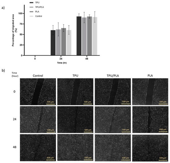 The wound healing scratch test can be used to determine whether the scaffold or its degradation products accelerate or delay wound healing in vitro []. The results obtained with the scratch test are shown in Figure 4. Overall, it was visible that TPU, TPU/PLA, and PLA extracts did not inhibit cell migration in the in vitro wound model compared to the control group. There were no significant differences (p-value > 0.05) between the material types in terms of cell migration rate. After 24 h of treatment, BEAS-2B cells had covered 50% of the wound area and almost completely closed the site within 48 h.