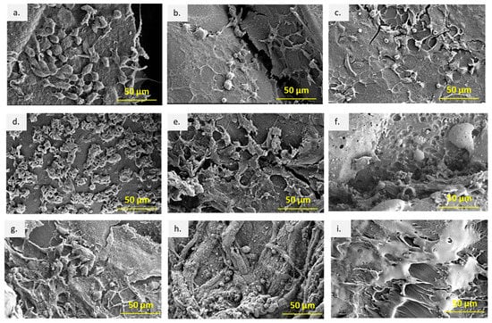 SEM images of the cells and tissues following subcutaneous implantation at different time points. (a) TPU at week 1, (b) TPU/PLA at week 1, (c) PLA at week 1, (d) TPU at week 4, (e) TPU/PLA at week 4, (f) PLA at week 4, (g) TPU at week 8, (h) TPU/PLA at week 8, and (i) PLA at week 8. Scale bar 50 µm.