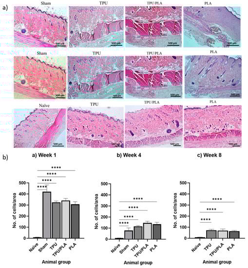 H&E staining of composite scaffolds at 1, 4, and 8 weeks post-implantation was used to assess scaffold biocompatibility and inflammatory cell infiltration at the implant site. Figure 7a shows general views of histological cross-sections of the wound area representing the TPU, TPU/PLA, and PLA scaffolds at weeks 1, 4, and 8, respectively. The inflammatory response was quantified by counting the number of inflammatory cells in the skin area adjacent to the scaffold. One-way ANOVA with Tukey’s multiple comparison test was used to compare between groups, as shown in Figure 7b. It was visible that there was a significant difference (p-values < 0.0001) in the number of inflammatory cells between all groups at all time points compared to the naïve group. In week 1, the number of inflammatory cells was highest in all experimental groups and decreased significantly in weeks 4 and 8.