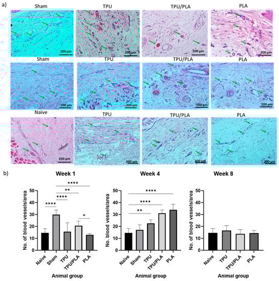 (a) Vascularisation of the tissue adjacent to the implanted scaffold at week 1. H&E staining shows blood vessels in the tissue adjacent to the implanted scaffold. The green arrow indicates the blood vessels. The highest number of blood vessels was observed in the sham and PLA groups. (b) Semi-quantitative analysis of vascularisation at different time points. Week 1, week 4, and week 8. The X-axis represents the grouping of animals, and the Y-axis represents the number of blood vessels per area. Compared to the naïve group, vascularisation at week 1 showed minimal changes in both the TPU and PLA groups, while it was significantly the highest in the sham group. However, a significant increase was observed in week 4, which was highest in PLA, followed by the TPU/PLA blend, and TPU. Finally, vascularisation was almost back to baseline at week 8. One-way ANOVA with Tukey’s multiple comparison tests was used for comparison between groups. Data are presented as mean ± SD, n = 2 animals per group, * p < 0.05, ** p < 0.01 **** p < 0.0001.
