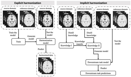 Workflow of Implicit and Explicit Computational Harmonisation Approaches for MRI Data. The explicit approach (left panel) involves training data from both source and reference domains to generate the harmonisation model. The source domain refers to the dataset that requires harmonisation, while the reference domain refers to the dataset that serves as a standard. The model is then tested using additional source domain data, resulting in the generation of harmonised data. In the implicit approach (right panel), data from the source and reference domains are processed separately, and the distilled knowledge is transferred from one to the other. The downstream task model is generated based on the transferred knowledge, and both source and reference domain data can be fed into the model to generate task-related predictions.